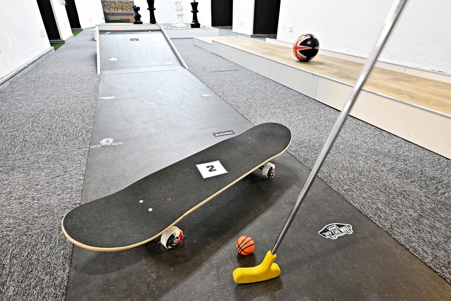 Spil et spil minigolf på Mazemania, en moderne minigolfbane i Prag. Nyd en sjov sportsoplevelse i et behageligt miljø, perfekt til familieudflugter, venskabsmøder eller firmaarrangementer. Spil på 18 helt utraditionelle huller, som hver især er placeret i originale omgivelser som en sportsplads, en stue eller en have. Spil på et skakbræt, en bowlingbane, et poolbord eller endda i en have med en dam. Slap af i det komfortable siddeområde, der er ideelt til familiesammenkomster, firmaarrangementer eller sammenkomster med venner.Includes