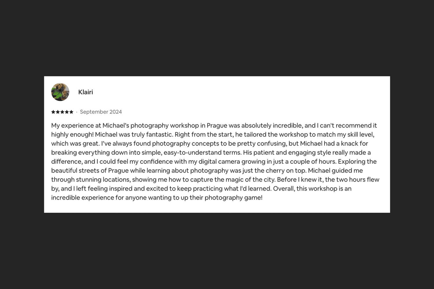 Do you have a DSLR camera with you on your vacation and find yourself constantly saying 'I bought this and I have no idea how to use it'? Do you feel like your vacation photos don't quite capture what you saw when you were there in front of something incredible? My name is Michael and I'm here to help with a travel photography workshop where you'll learn how to not just take a photo, but how to MAKE a photo. We’ll meet at the National Theater and start with a short camera tutorial. I’ll talk to you about what all those buttons and dials do plus an introduction to some photography fundamentals. We’ll then take a walk through Prague's historic Old Town and practice shooting together near some of Prague’s most famous and beautiful landmarks. My goal is to cover the most common vacation photography scenarios. Things like architecture, landscape/cityscapes, and some basics of shooting a nice portrait. 90% of what I cover in this class is perfectly applicable to smartphone cameras so I encourage anyone shooting with their phone cameras to join. We’ll end our class in Letna Park with my favorite view of the city. You’ll leave my class with some beautiful photos of Prague plus some simple tips and tricks to help you capture your vacation in the best way possible.Includes