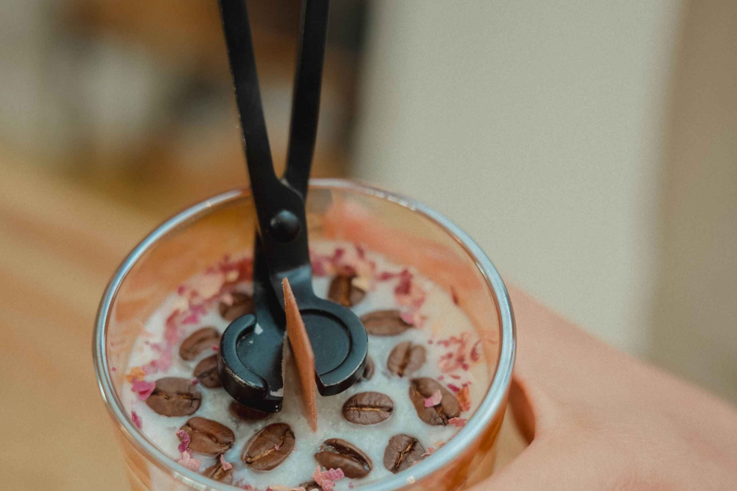 Atelier de fabrication de bougies Manuel d'instruction Photophore en verre de 300 ml avec couvercle dans la couleur de votre choix 200 grammes de mélange de cire de soja et de noix de coco Essence de bougie - vous pouvez choisir parmi de nombreuses options et les combiner Mèche de bougie en bois Décorations pour bougies (choisissez jusqu'à 3 sortes différentes) Autocollant de bougie pour la personnalisationImportant Information