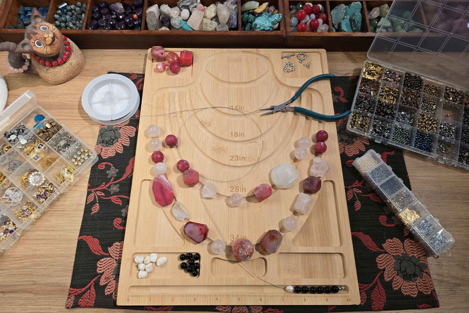 - The workshop lasts 45 minutes, no previous experience needed! Participants can choose to make a necklace, bracelet, or earring-pendant. Participants will select their own combination of stones, crystals, or pearls. Additional details, such as clasps or decorative elements, can be chosen. Jewelry is created on an elastic or special wire string.