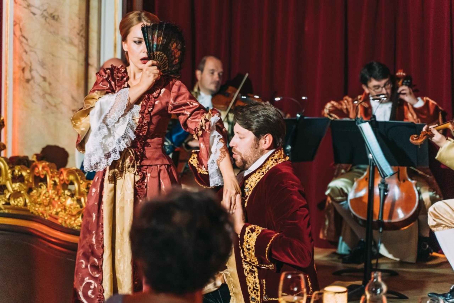 Entra nello spirito festivo e assisti a un concerto di Natale con musiche di Mozart eseguite da cantanti e musicisti in costumi d'epoca. Raggiungi la splendida sala da ballo Boccaccio del Grandhotel Bohemia e assapora un menu di 4 portate ispirato a ricette della cucina ceca e austriaca. Ascolta una selezione di canti natalizi eseguiti da Amadeus Prague, con cantanti lirici provenienti dai teatri d'opera cechi e strumentisti dell'Orchestra Sinfonica della Radio di Praga. Immergiti nella gloriosa atmosfera della sala da ballo d'epoca, decorata con marmo artificiale, oro e cristallo. Situata nel cuore della Città Vecchia, la sala era un luogo popolare per organizzare grandi feste fino all'inizio dell'era comunista. Ogni segmento del concerto sarà eseguito tra una portata e l'altra per offrire una festa complementare per le orecchie mentre ascolti i brani preferiti di Don Giovanni, Il flauto magico e altri classici di Mozart.Includes
