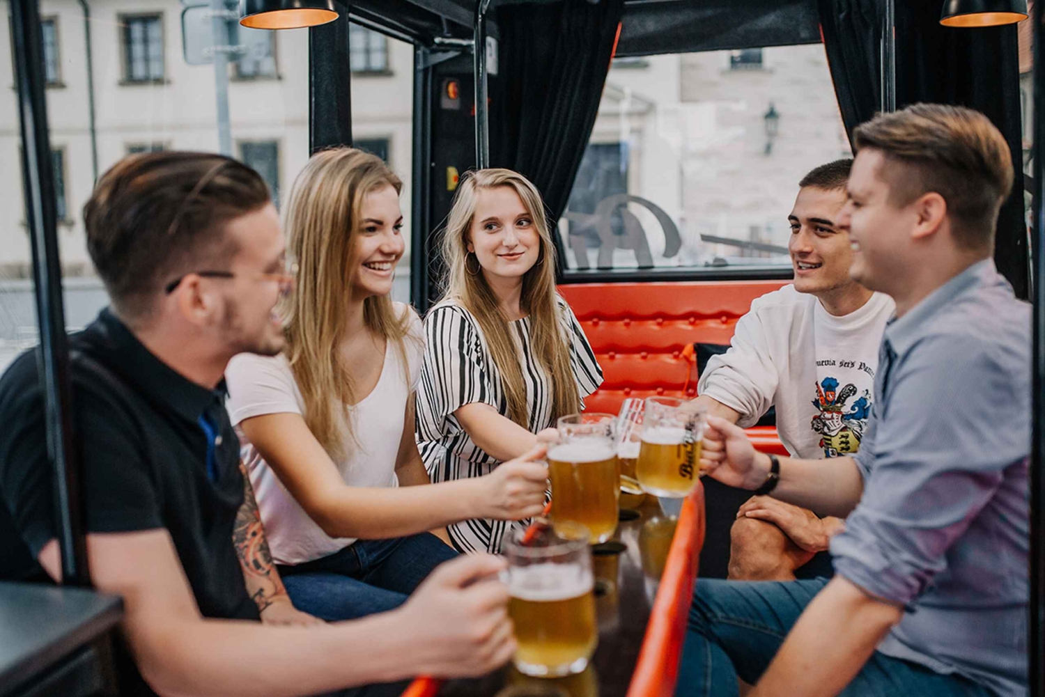 Etter å ha blitt hentet på flyplassen, tar ølbussen deg til destinasjonen din hvor som helst i Praha. Du kan sitte i de komfortable setene og drikke kaldt fatøl mens bussen kjører deg til hotellet eller ankomststedet du har valgt. Prat, drikk, dans, rave - det er din fest. Det finnes ingen bedre måte å starte ferien i Praha på. Slå på musikken med lydanlegget og nyt utsikten fra de store vinduene. Du blir sittende sammen med vennene dine og nyte begynnelsen på oppholdet i Praha. Ta en tur fra flyplassen på en unik og morsom måte med denne ølpartybussen.Includes