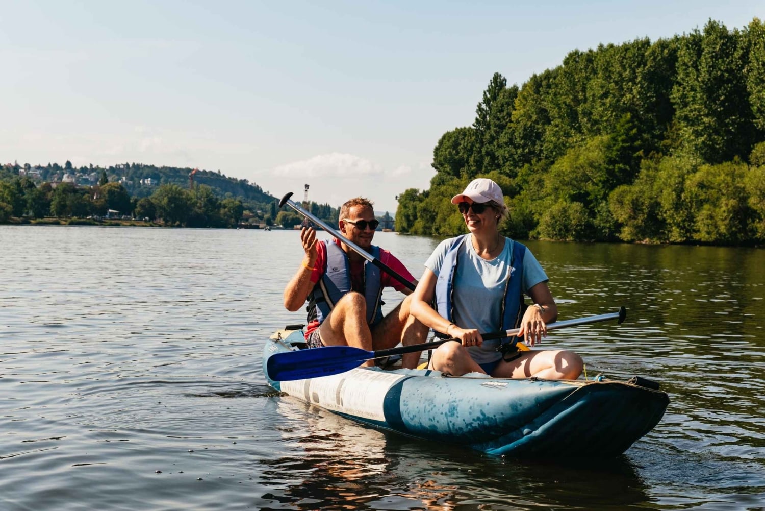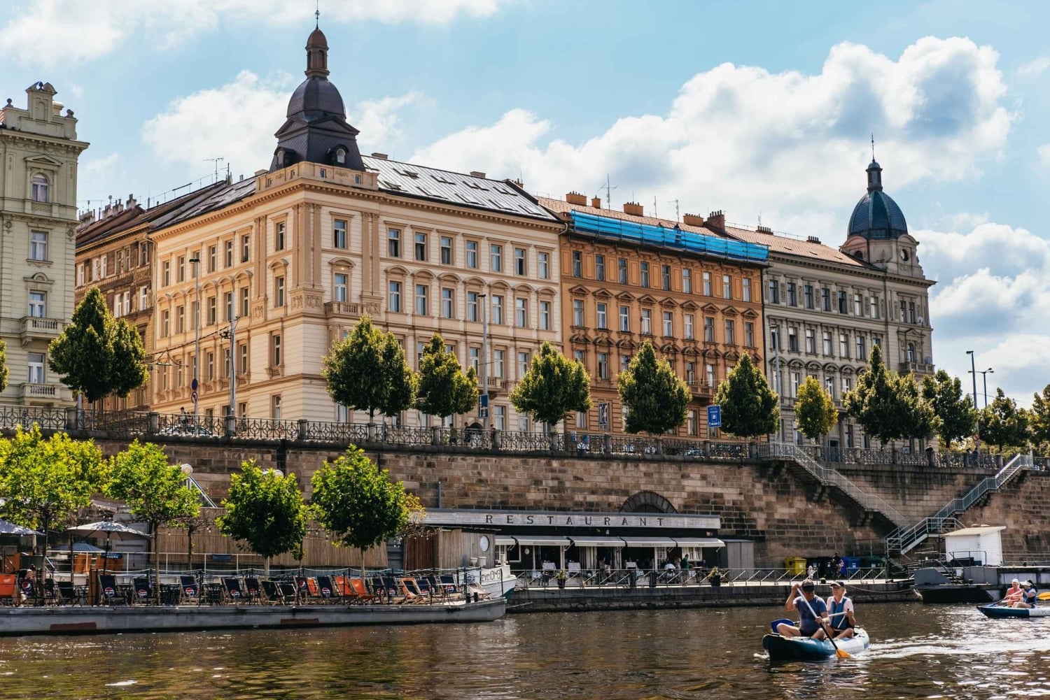 Spłyń kajakiem po Wełtawie w Pradze. Przepłyń pod łukami kultowych mostów, miń Tańczący Dom i zobacz Teatr Narodowy, podczas gdy Twój przewodnik przekaże Ci więcej informacji na temat niektórych z najważniejszych zabytków miasta. Płyń wzdłuż rzeki z dala od zatłoczonych wąskich uliczek Starego Miasta i odkryj piękno Pragi z innej perspektywy. Dostrzeż lokalną faunę i florę oraz małe gatunki ptaków i dowiedz się więcej o tym tętniącym życiem mieście od swojego przewodnika. Po wycieczce zrelaksuj się w małym pubie z najpiękniejszym widokiem na Zamek Wyszehradzki. Ciesz się lanym piwem, świeżym mojito, grillowanym mięsem lub kiełbaskami, lodowymi lizakami i wieloma innymi drobnymi smakołykami (nie wliczone w cenę) lub wypożycz własnego grilla.Includes