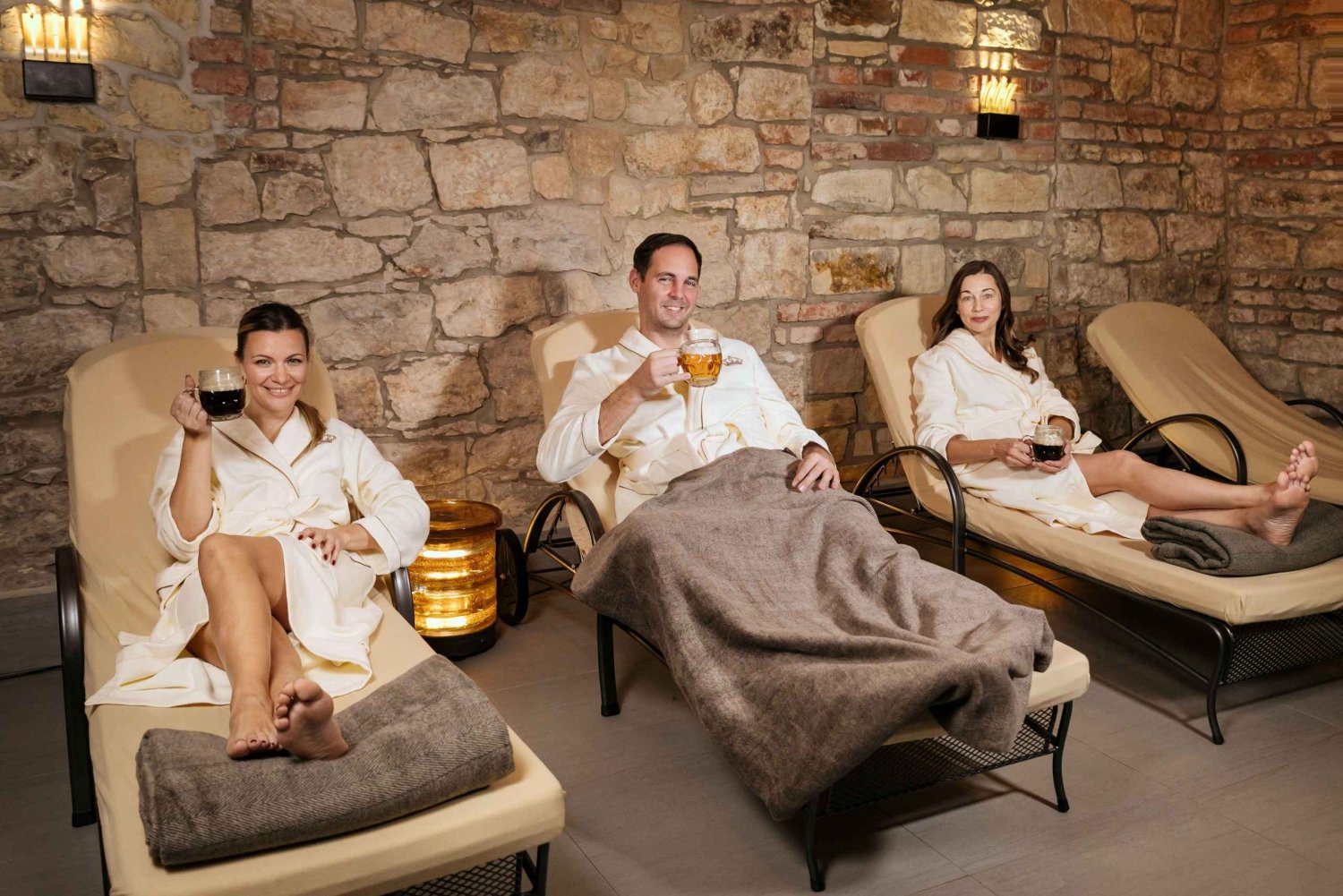 Njut av den perfekta kombinationen av välbefinnande och tradition på Prags öl- och vinspa. Välj mellan vin-, öl- eller wellnessbad med obegränsad dryck. Koppla av efter dagen med ett bad i öl eller ett terapeutiskt bad. Njut av badritualer med anknytning till gamla tjeckiska traditioner. I ölbadet får du obegränsat med öl. I vinbadet får du 2 glas Prosecco. I hälsobadet får du aromatisk örtte från vår samling. Njut av de naturliga ingrediensernas och örtextraktens välgörande effekter. Vid ankomsten får du information om hela behandlingen av en spa-assistent. Du får ett omklädningsrum med skåp, handduk, tofflor och lakan. Du behöver därför inte ta med badkläder. Men om du har, kan du ta med dem. Dela upp rummet i mindre utrymmen för grupper med en skjutdörr och njut av gardiner för avskildhet. Ölspabehandling I ölspaet kan du njuta av de återfuktande, hudregenererande och antiinflammatoriska effekterna av en blandning av öljäst och naturliga humleingredienser i varmt vatten. Känn hur tröttheten försvinner när kroppen suger upp vitaminerna från jästen. För att förstärka effekten av detta bad, drick mörk eller ljus öl. Vinspa-behandling För vinspa får du ett bad berett av rött vin, druvkärnor och vinstocksextrakt, vinjäst, honung, fransk lavendel och doftande oljor. Känn de föryngrande effekterna av dessa näringsämnen när de återställer vitaliteten och förbättrar blodcirkulationen. Smutta på vin och befria kropp och själ från stress. Wellness-spabehandling – Kolsyrebad – Lerbad – Magnesiumbad – SyrebadIncludes